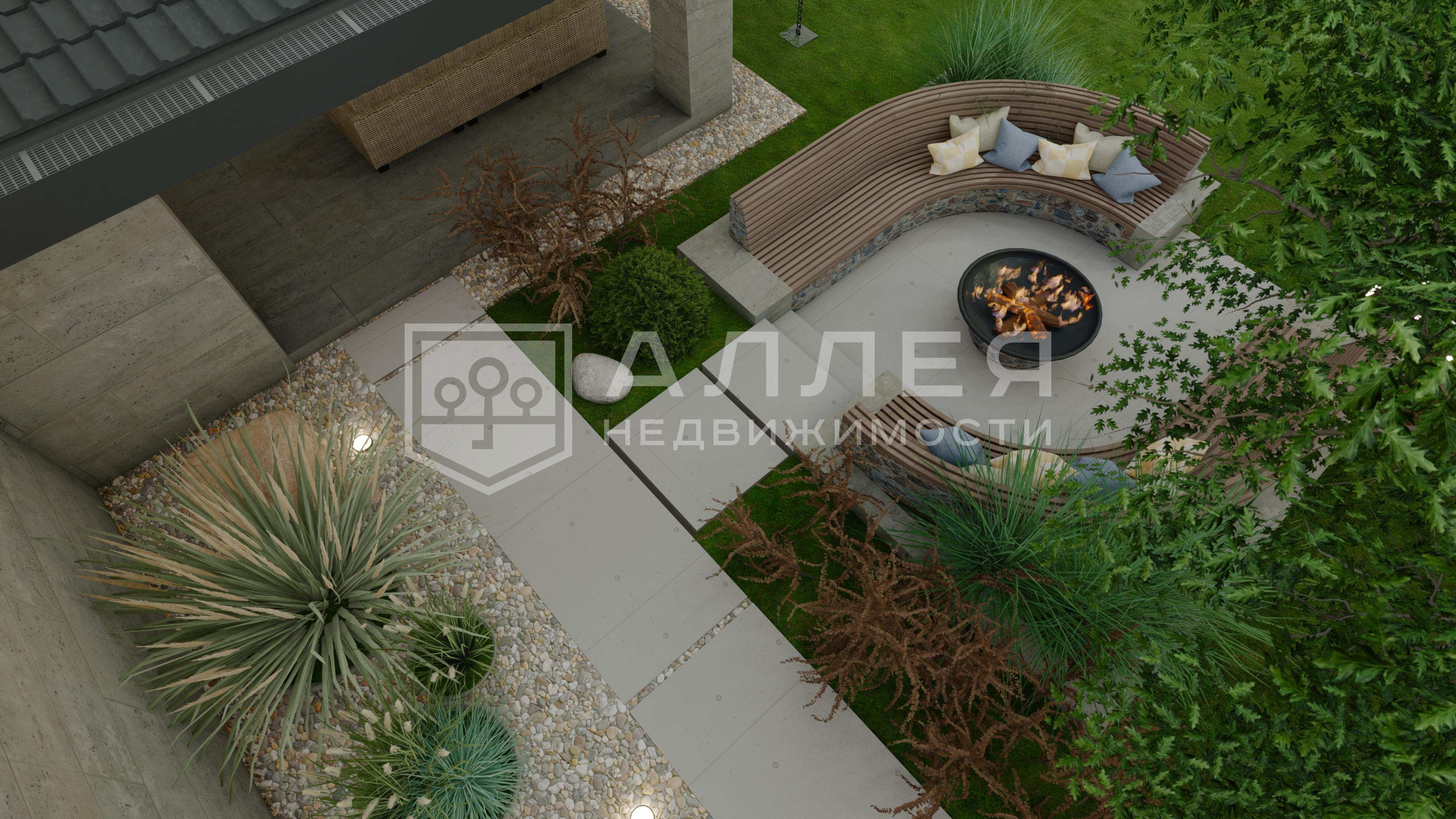| Описание: | Участок квадратной формы с газоном и декоративными растениями. |