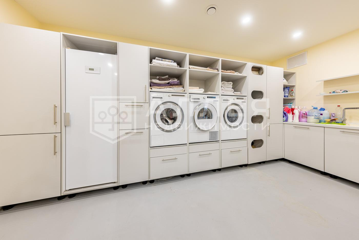 Цоколь: кухня с лифтом, постирочная, гараж, 3 кладовые комнаты, холодильник для одежды, серверная